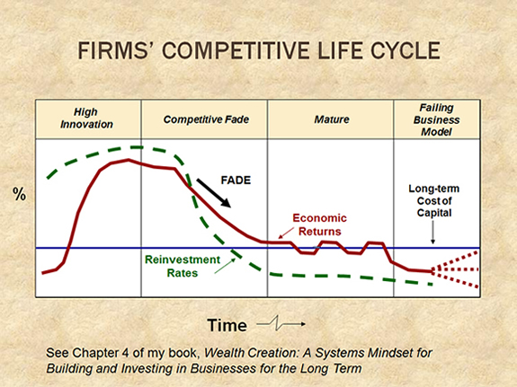 The firms’ competitive life-cycle framework is based on the premise, as illustrated in Figure 2, that competition and capital flows operate over the longer term to force a firm’s economic returns toward the cost of capital. In short, the pattern (“fade” rate) of a firm’s economic returns and reinvestment rates reflects an unending struggle between managerial skill and competition over time.